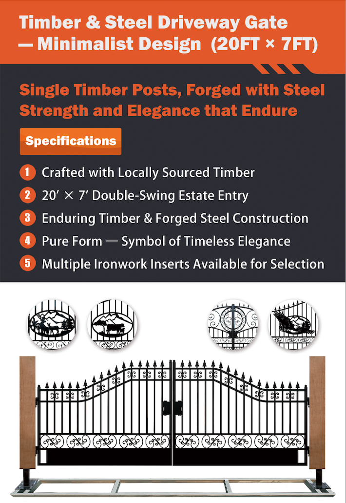 Featuring a clean, pattern-free steel frame paired with solid timber posts, the minimalist design highlights proportion, material quality, and craftsmanship—making it ideal for modern estates, contemporary homes, and understated rural properties.