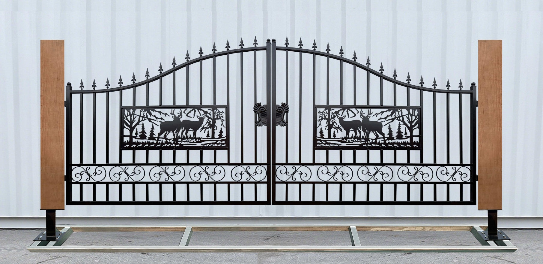 • Fully welded mild steel gate panels with rectangular deer-pattern scrollwork